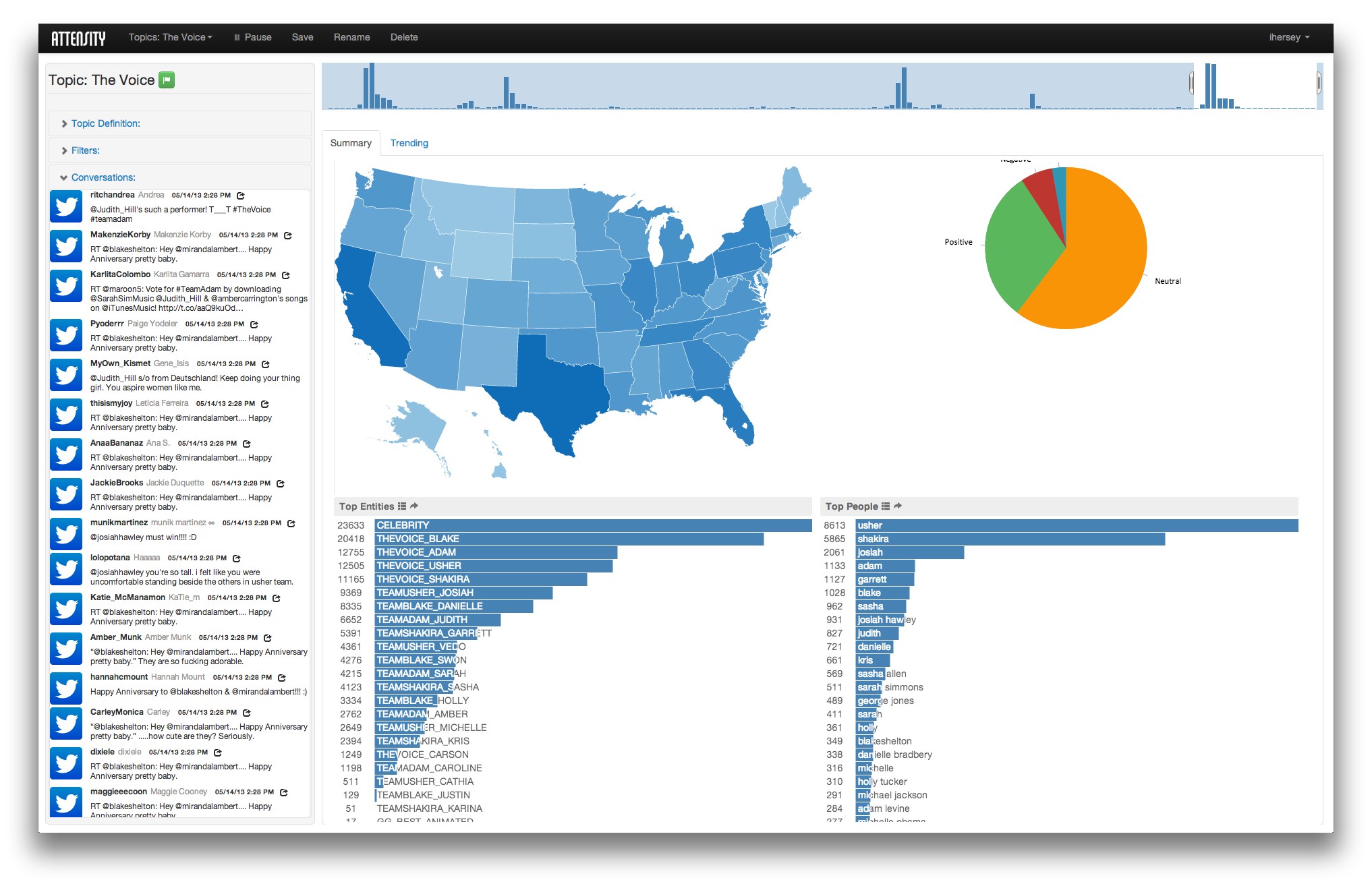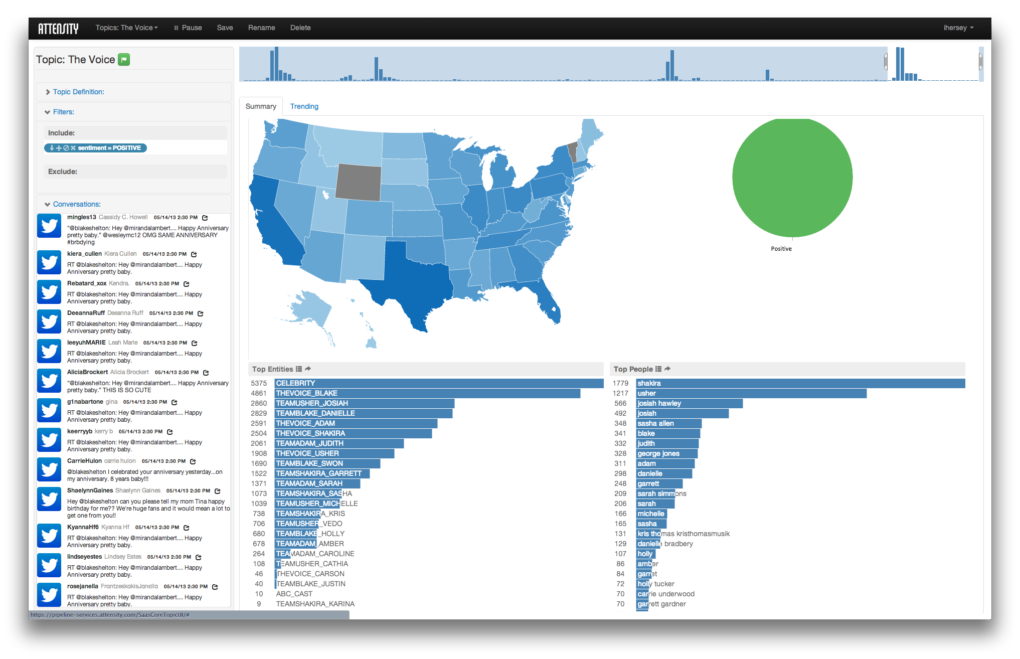 Last week, the Twitter-derived numbers correlated reasonably well. Not perfectly, though. For Team Adam, I hadn’t set up the topic in time, so had about 1/5 of the numbers I had for the Team Blake and Team Shakira contestants. So there my numbers were just plain off. The other factor was the judge’s discretion, and Blake elected to save the Swon Brothers rather than Justin Rivers. Welcome to the big leagues!