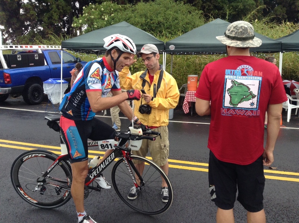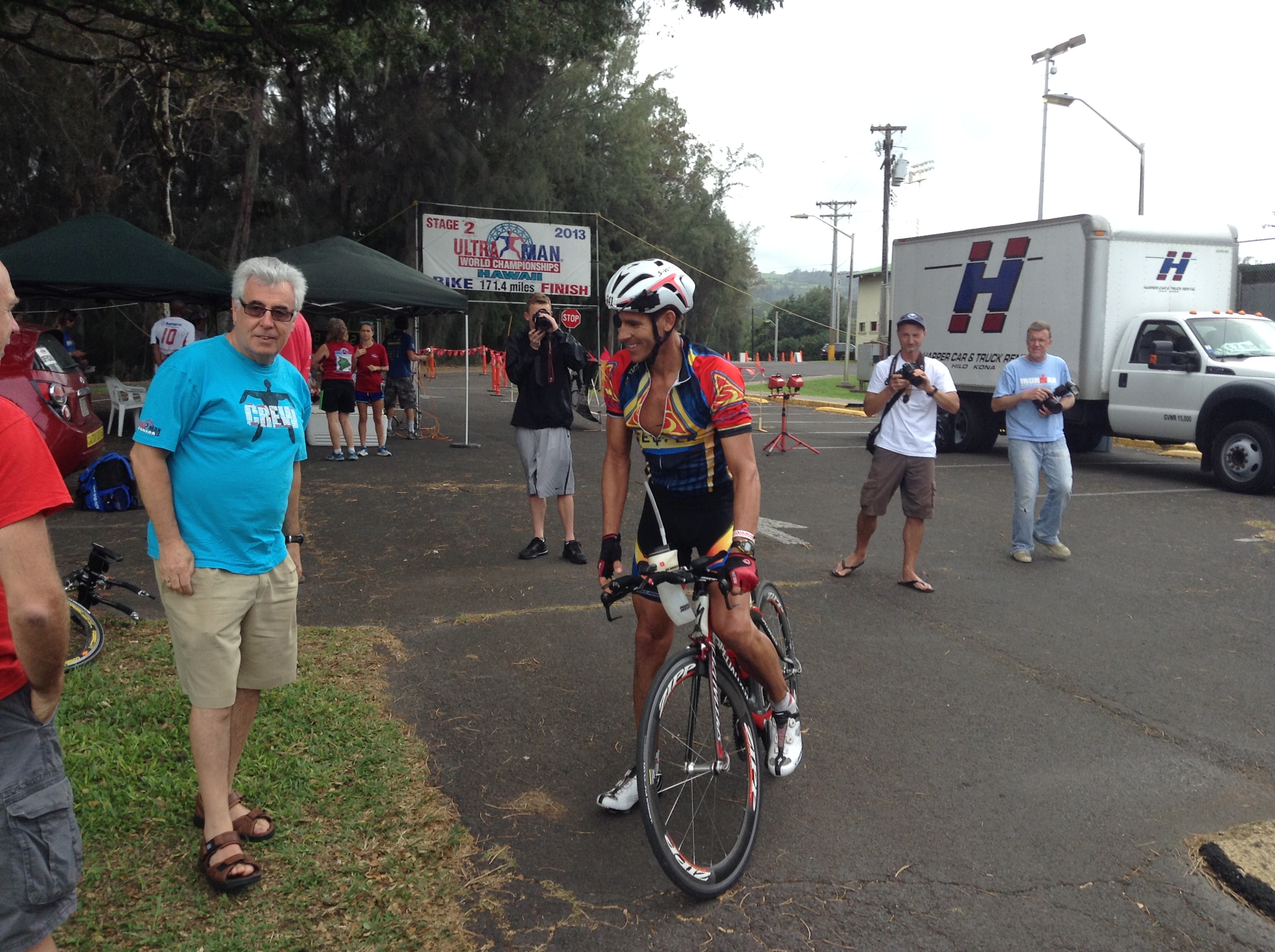 See, Ultraman is the opposite of Ironman. Instead of 2000 Type-A racers taking over Kailua-Kona and the Queen K highway for more than a week, Ultraman has roughly 35 competitors, doesn’t close any roads, and has no aid stations. Each athlete is completely supported by his own crew, from a guide kayaker on the swim to a van that acts as a mobile aid station, leapfrogging the rider to hand off food and drinks and anything else the rider needs.