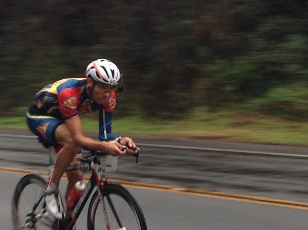 But Tim passed her about 20M into the 90M bike, so we were on our own after that – we didn’t see another team the rest of the day. The elements were tough: headwinds, crosswinds and pouring rain, plus a final climb of almost 3000 ft up to Volcano and the finish line.