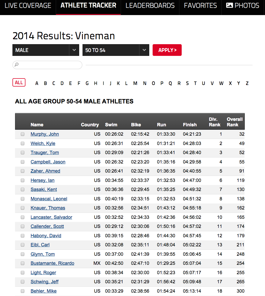 This netted me my best Ironman placing of the year (Ironman events tend to be more competitive), 6th in M50-54. The top 4 were in a completely different zip code; even 5th was well out of reach. Regardless of place, though, I’m ecstatic with my first real crushing of the 5-hour barrier. I’m not sure what I did right on this one, other than maybe going in with low expectations and just focusing on pace and preparing myself for the heat during the run.