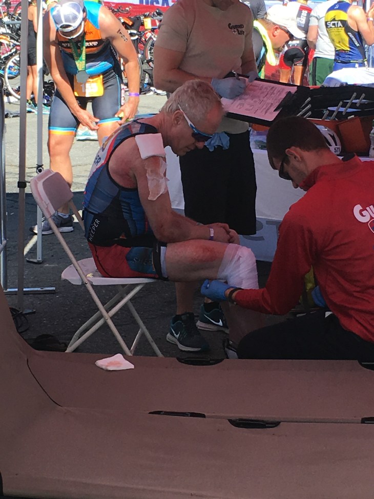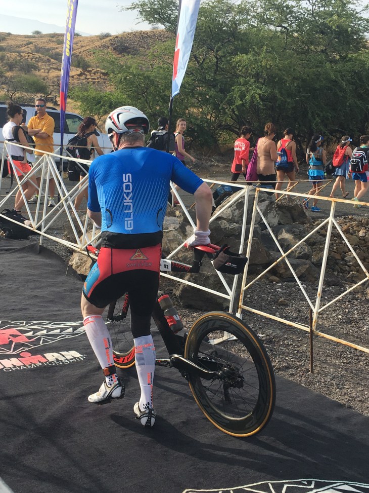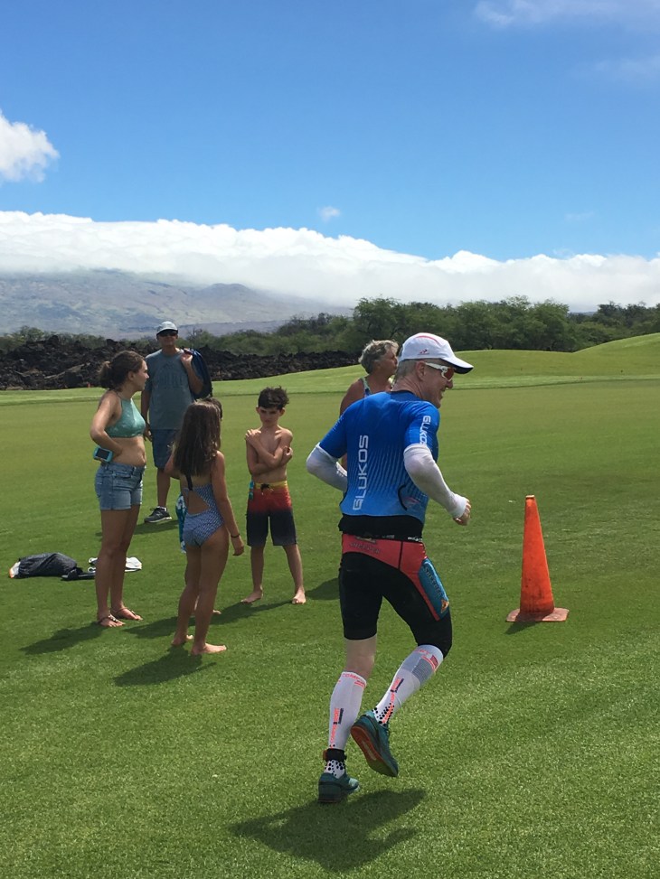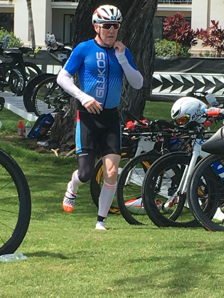Going into Honu, my chief concern was sun protection – you want to avoid direct sun exposure on the wounds if you care about scarring. Although my modeling days are pretty much behind me, I took the advice to heart and made my race-day wardrobe choices: short-sleeved tri top, white arm coolers, a thin knee warmer on my right knee, and white compression socks, all of which would be put on in T1. I was definitely not going to win any “fastest transition” prizes.