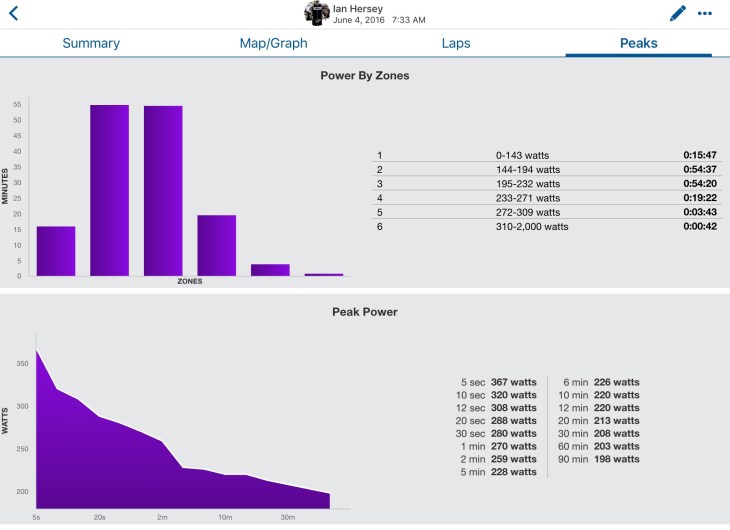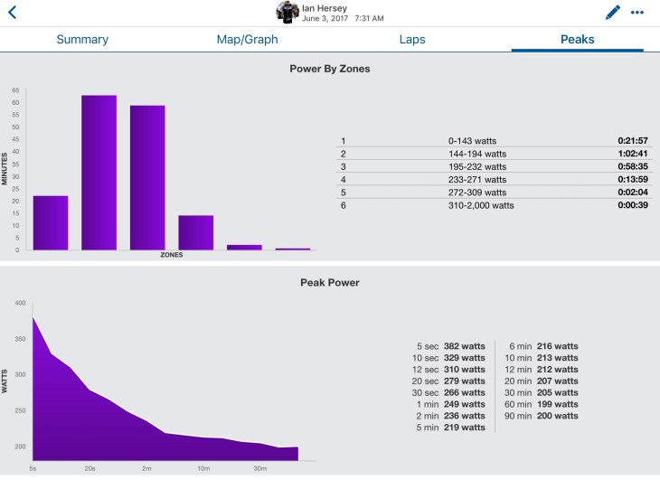 The transition from swim to bike took a while, as I was putting on arm coolers, a knee cover and compression socks in addition to my normal helmet, glasses and shoes. This added an extra 3-4 minutes of time over the normal process but avoided sunburn and additional scarring of the residual wounds from 13 days earlier. Once out on the Queen K, I settled into my target power of 210-215W. This course, however, is quite undulating, and the winds shift fairly frequently, so it’s difficult to ride a steady power. I found myself fluctuating quite a bit:Ideal would be mostly Zone 3, but that would likely come on a flat course with little-to-no wind. Here’s last year’s for comparison, where I went 11 minutes faster: