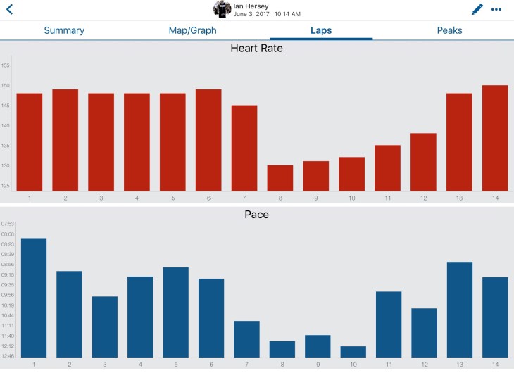 The pace got very ugly in the middle of the race – obviously there I did a ton of walking. But my heart rate also dropped during that section, which allowed my body the opportunity to absorb more of what I was taking in at the aid stations. The effect of that, which the graph illustrates, is that mile 13 ended up being my second-fastest mile, and I definitely felt like I was coming good again.
