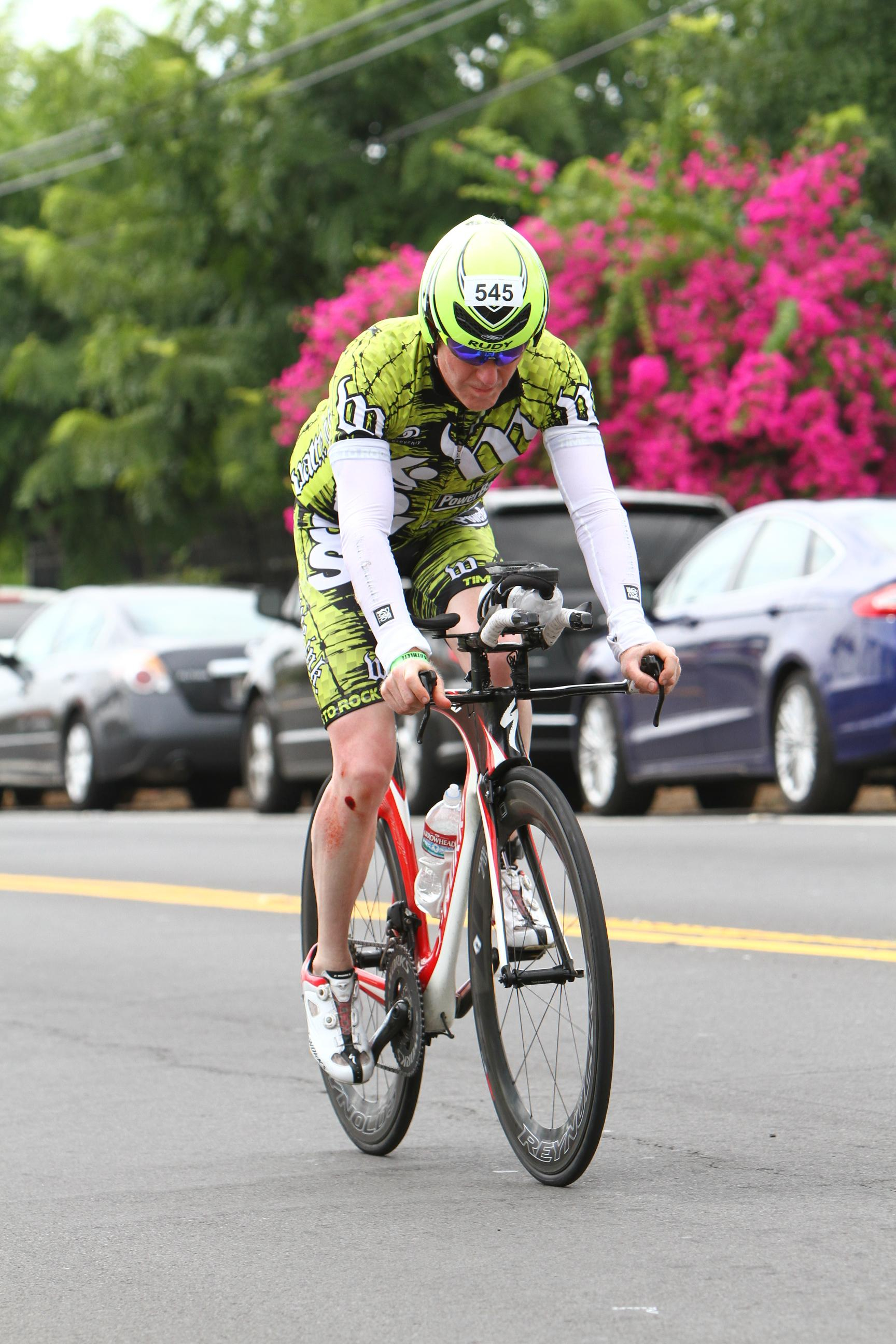 I was riding well within my planned power output and feeling good, but around mile 35 (near Puako), disaster struck. A guy I was passing suddenly moved left (without looking) into me. I had a guy coming up on my left so had nowhere to go. I called out to the guy, but he was already touching me; then his front wheel hit my bike, and he went down, which then took my rear wheel out from under me. The next thing I knew, I was sliding on the pavement on my right leg. F**k!